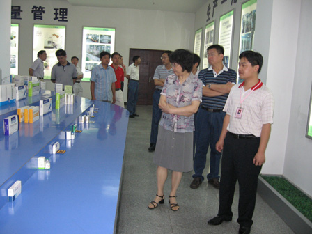 2008年7月17日,山東羅欣藥業股份有限公司2008年第一次股東特別大會在三樓會議室隆重召開。參會股東、董事、監事在公司領導的陪同下參觀了展廳以及三期產能擴建工程等,對公司發展情況進行了全面了解。下圖為公司股東、董事、監事在公司執行董事韓風生先生(右一)陪同下參觀公司展廳。