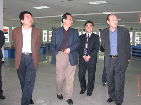 上圖為省經貿委行業發展處副處長張新明(前排左二)、省醫藥行業協會會長賀端湜(前排右一)淄博市醫藥行業協會李祥麟主任(前排左一)參觀展廳時的情景