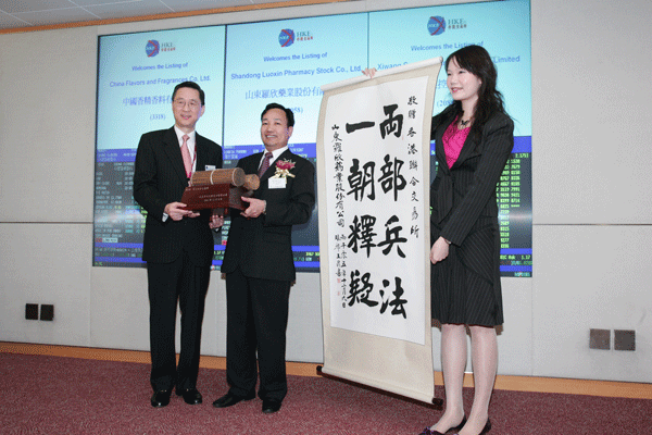 羅欣藥業股票上市儀式贈送香港聯交所紀念品留影1
